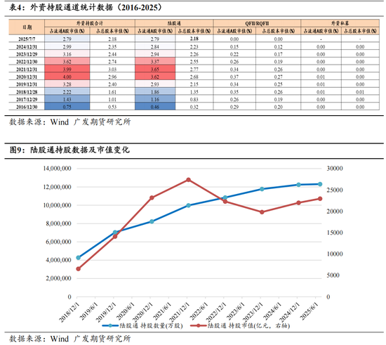 最后,我们仍需密切跟踪的是外资持有A股的主要渠道的变化情况,基于表4的统计,2016年至今,外资持股通道中,陆股通的份额逐渐提升,但外资持股占流通A股市值的占比在2021年底达到了峰值后近三年一直在下降。2021年的A股市场也的确体现了一些外资定价的特征。同时再看陆股通持股数量、市值(图9),今年上半年已有缓慢回暖,但尚未出现明确抬升势头。我们按照当前A股流通市值推算,外资持股比例每抬升0.01%,即带来8100亿元以上增量资金,相当于沪深300指数总流通市值的4.21%,而当前外资持有A股流通市值的比例比2019年贸易战时期还要低0.5%。