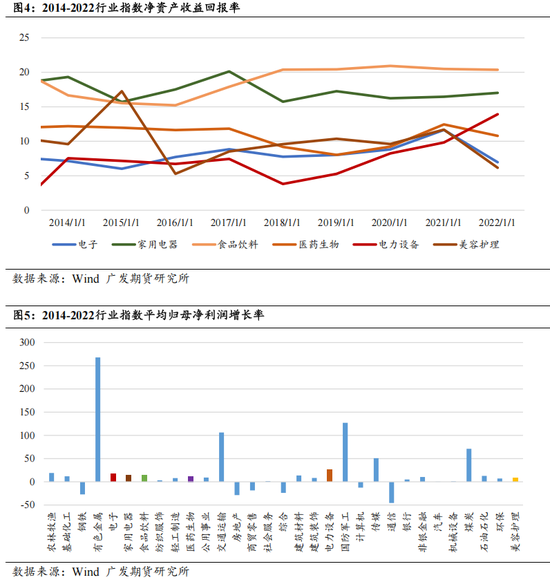 行业集中度高:偏好盈利稳定的消费类龙头,电子(区间收益70.9%)、家电(79.1%)、食品饮料(291.1%)、医药生物(51.2%)超额收益显著(表2)。此类行业ROE常年维持10%-20%(图4),但成长性弱于科技板块。