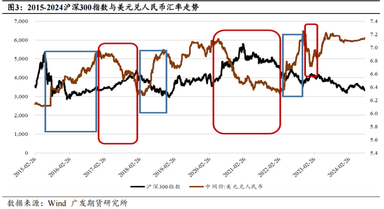 基于国家外汇管理局的统计数据(图1),2012-2014、2016-2021是我们的统计区间内境外投资我国证券净流入增长明显加快的两个时期,而境外投资流出较大的两个时期是2018-2019、2022-2023。如果再结合图2的美元兑人民币汇率走势看,外资流入及流出的趋势与汇率呈现出强相关性,因此我们认为,对人民币证券资产(包含股票及债券)的估值提升最直接的影响因素即是汇率展望,并且这也顺理成章地导致了国际资本的流入/流出。