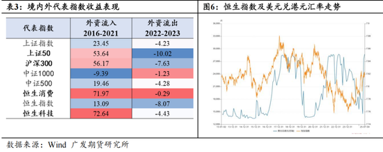 除却行业偏好之外,由于香港地区的监管属性和港元的联系汇率制度对于外资更加友好,在国际资本集中流入的时期,港股往往先开启上涨行情,并且弹性较A股更好。并且外资流出时,也是反映在港股的先一步见顶回落。我们再次以前述2016-2021、2022-2023作为两个观察目标期,可以看到流入期港股和A股代表性指数中收益最高的是恒生消费和恒生科技,内地综合指数也是蓝筹性质的上证50、沪深300表现较为出色;流出期则上证50、沪深300的跌幅更大。这与我们上面所总结的行业偏好有互相印证之处,也即外资偏向重仓消费类行业权重高的大盘指数。