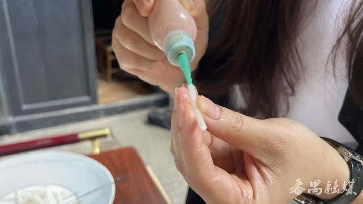 通过特制的细小瓶口将肉蓉灌进芽菜